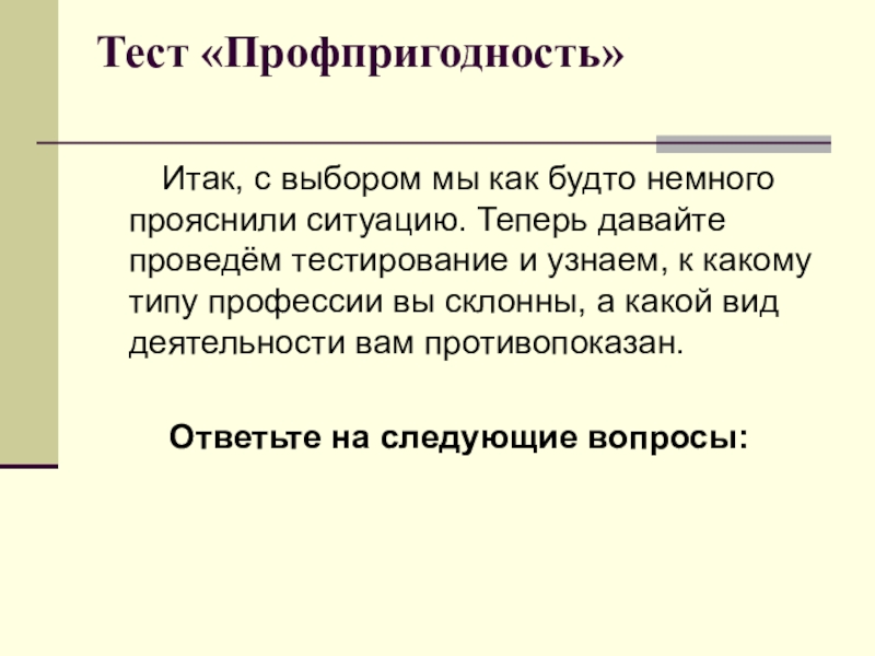 немного прояснили ситуацию. Теперь давайте проведём тестирование и узнаем, к какому типу профессии вы склонны, а какой вид деятельности вам противопоказан.