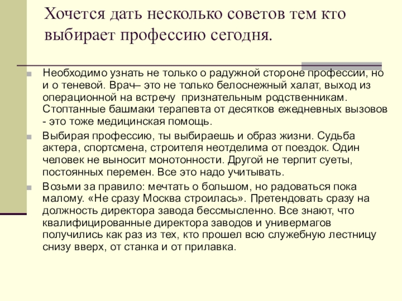 Слайд 14Хочется дать несколько советов тем кто выбирает профессию сегодня.