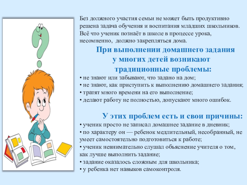 Иногда родители, желая помочь своему ребенку в преодолении трудностей учения, пытаются помочь ему в выполнении домашних заданий. Они пишут сочинения, исправляют ошибки, решают задачи, тем самым они лишают ребенка получения удовольствия от собственных достижений.