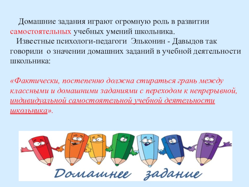 Известные психологи-педагоги Эльконин - Давыдов так говорили о значении домашних заданий в учебной деятельности школьника:
