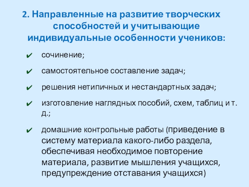 Слайд 5 2. Направленные на развитие творческих способностей и учитывающие индивидуальные особенности