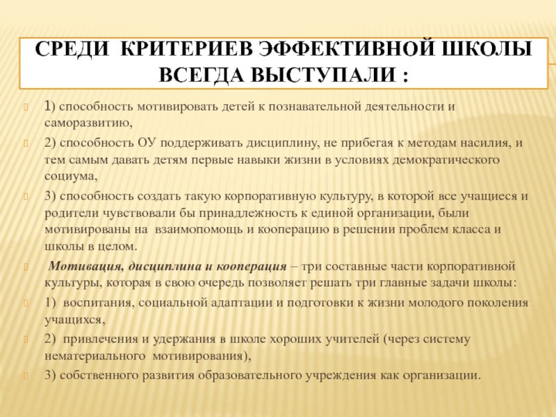 Мотивация, дисциплина и кооперация – три составные части корпоративной культуры, которая в свою очередь позволяет решать три главные задачи школы: