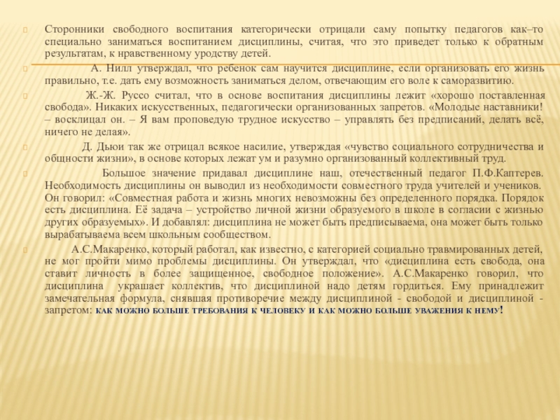 воспитанием дисциплины, считая, что это приведет только к обратным результатам, к нравственному уродству детей.