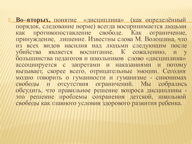 как противопоставление свободе. Как ограничение, принуждение, лишение. Известны слова М. Волошина, что из всех видов насилия над людьми следующим после убийства является воспитание. К сожалению, и у большинства педагогов и школьников слово «дисциплина» ассоциируется с запретами и наказаниями и потому вызывает, скорее всего, отрицательные эмоции. Сегодня модно говорить о гуманности и гуманизме - синонимах свободы и отсутствия ограничений. Мы собрались обсудить, что правильное решение вопроса дисциплины - это решение проблемы сохранения детской, школьной свободы как главного условия здорового развития ребенка.