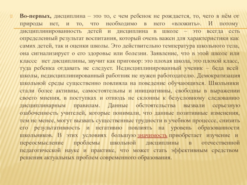 чего в нём от природы нет, и то, что необходимо в него «вложить». И потому дисциплинированность детей и дисциплина в школе – это всегда есть определенный результат воспитания, который очень важен для характеристики как самих детей, так и оценки школы. Это действительно температура школьного тела, она сигнализирует о его здоровье или болезни. Заявление, что в этой школе или классе нет дисциплины, звучит как приговор: это плохая школа, это плохой класс, туда ребенка отдавать не следует. Недисциплинированный ученик – беда всей школы, недисциплинированный работник не нужен работодателю. Демократизация школьной среды существенно повлияла на поведение обучающихся. Школьники стали более активны, самостоятельны и инициативны, свободны в выражении своего мнения, в поступках и отнюдь не склонны к безусловному следованию дисциплинарным правилам. Данные обстоятельства вызвали серьезную озабоченность учителей, которые понимали, что данные позитивные изменения, тем не менее, могут вызвать существенные трудности в учебном процессе, снизить его результативность и негативно повлиять на уровень образованности школьников. В этих условиях большую значимость приобретает изучение и переосмысление проблемы школьной дисциплины в отечественной педагогической науке и практике, что может стать эффективным средством решения актуальных проблем современного образования.