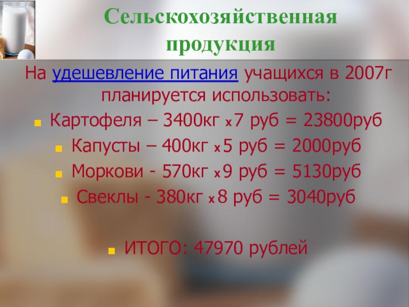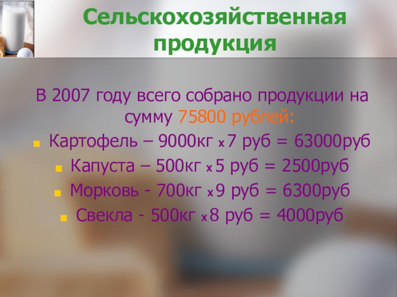 В 2007 году всего собрано продукции на сумму 75800 рублей: