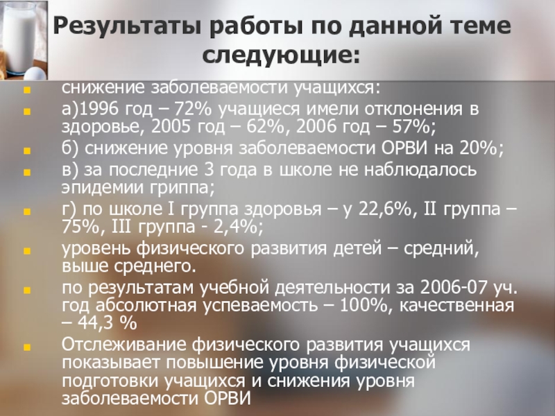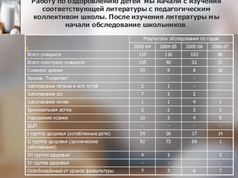 а)1996 год – 72% учащиеся имели отклонения в здоровье, 2005 год – 42%, 2006 год – 35%;