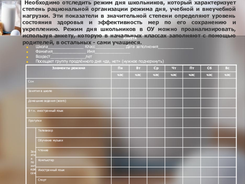 Слайд 9 Необходимо отследить режим дня школьников, который характеризует степень рациональной организации