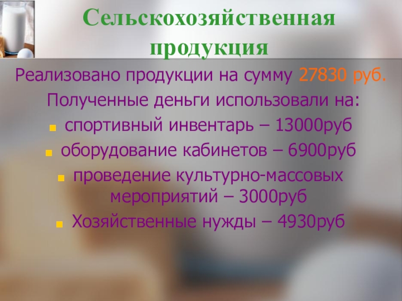 Слайд 59Реализовано продукции на сумму 27830 руб.