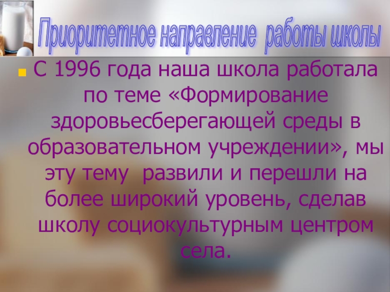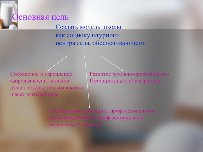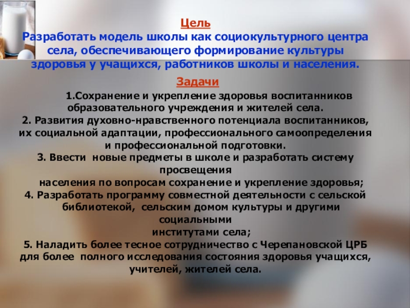Разработать модель школы как социокультурного центра села, обеспечивающего формирование культуры здоровья