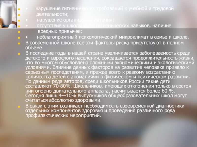 Слайд 5• нарушение гигиенических требований к учебной и трудовой