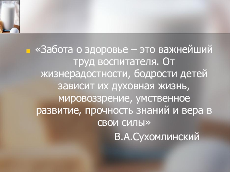 «Забота о здоровье – это важнейший труд воспитателя. От жизнерадостности, бодрости
