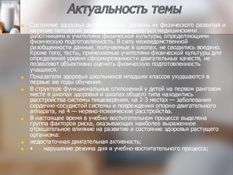 В настоящее время в учебно-воспитательном процессе выделена группа факторов риска, оказывающих наиболее выраженное отрицательное влияние на развитие и состояние здоровья растущего организма: