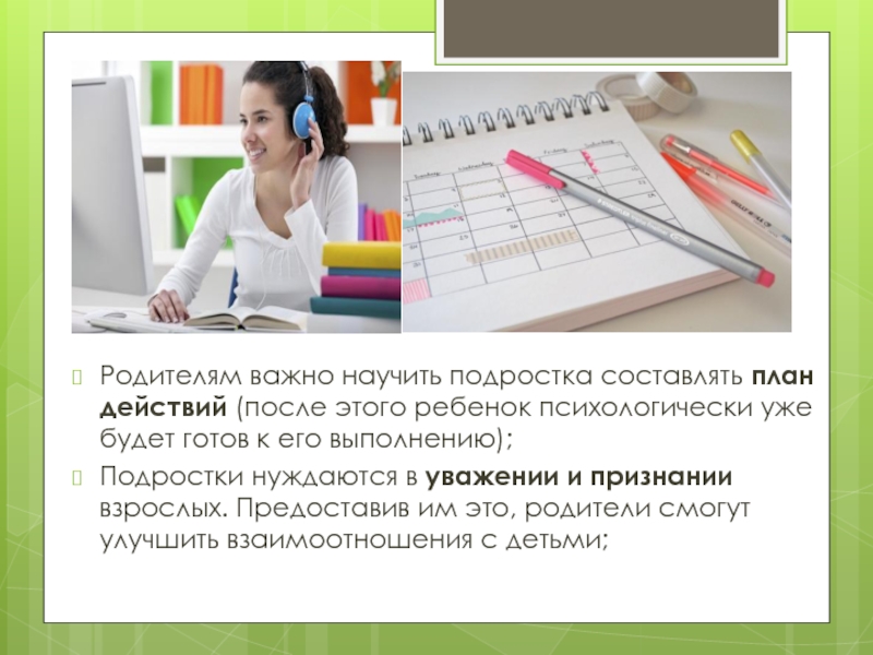 Слайд 26Родителям важно научить подростка составлять план действий (после этого ребенок психологически