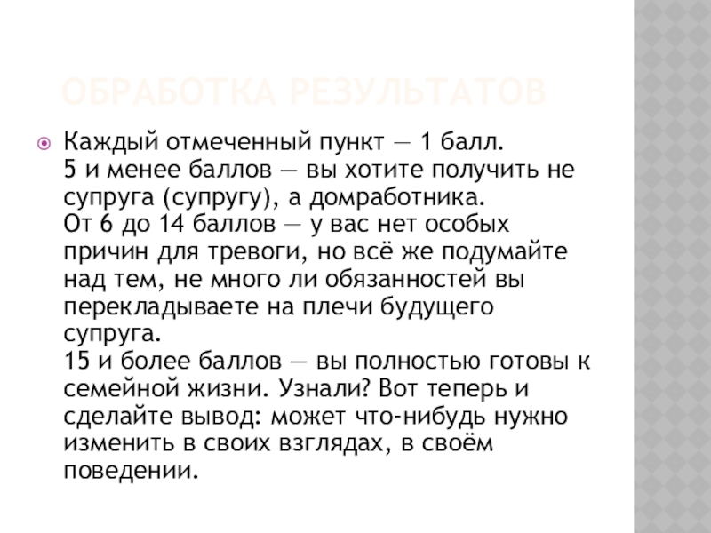15 и более баллов — вы полностью готовы к семейной жизни. Узнали? Вот теперь и сделайте вывод: может что-нибудь нужно изменить в своих взглядах, в своём поведении.
