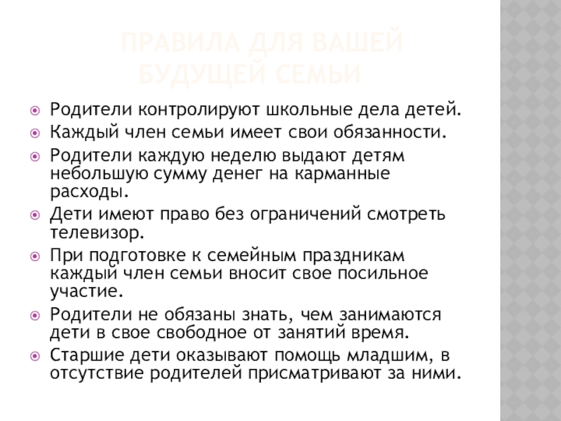 Слайд 8 Правила для вашей будущей семьи