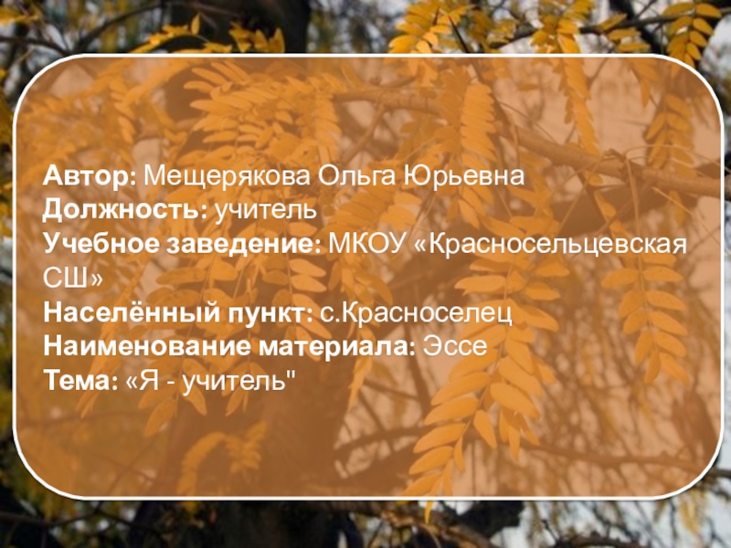 Автор: Мещерякова Ольга Юрьевна Должность: учительУчебное заведение: МКОУ «Красносельцевская СШ» Населённый пункт: с.Красноселец Наименование материала: Эссе Тема: «Я - учитель"