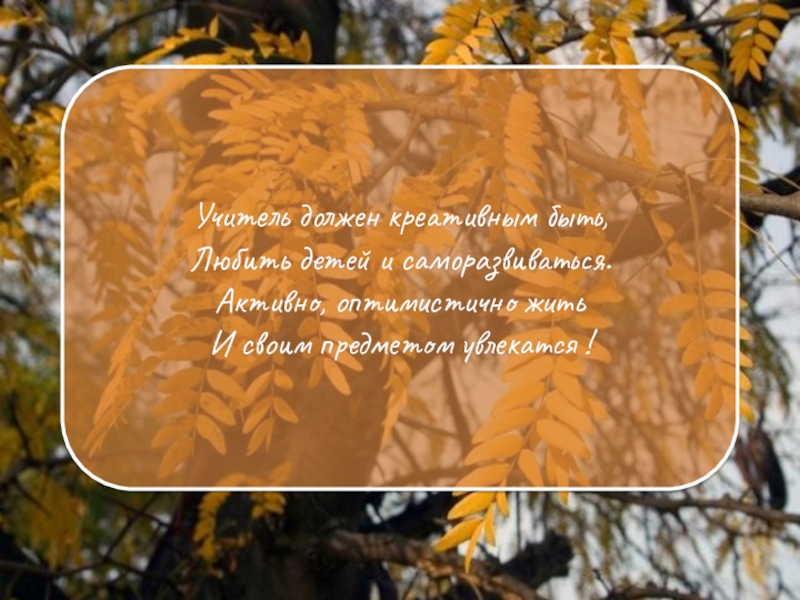 Учитель должен креативным быть, Любить детей и саморазвиваться. Активно, оптимистично жить И своим предметом увлекатся !