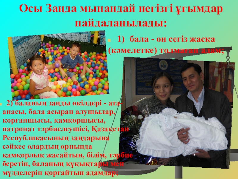 2) баланың заңды өкілдерi - ата-анасы, бала асырап алушылар, қорғаншысы, қамқоршысы, патронат тәрбиелеушiсi, Қазақстан Республикасының заңдарына сәйкес олардың орнында қамқорлық жасайтын, бiлiм, тәрбие беретiн, баланың құқықтары мен мүдделерiн қорғайтын адамдар;