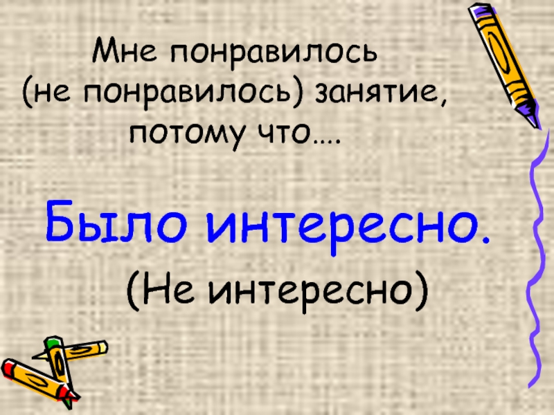 Мне понравилось  (не понравилось) занятие, потому что….Было интересно. (Не интересно)