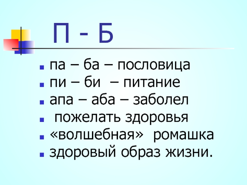 П - Б па – ба – пословица пи – би – питание апа – аба – заболел пожелать здоровья «волшебная» ромашказдоровый образ жизни.