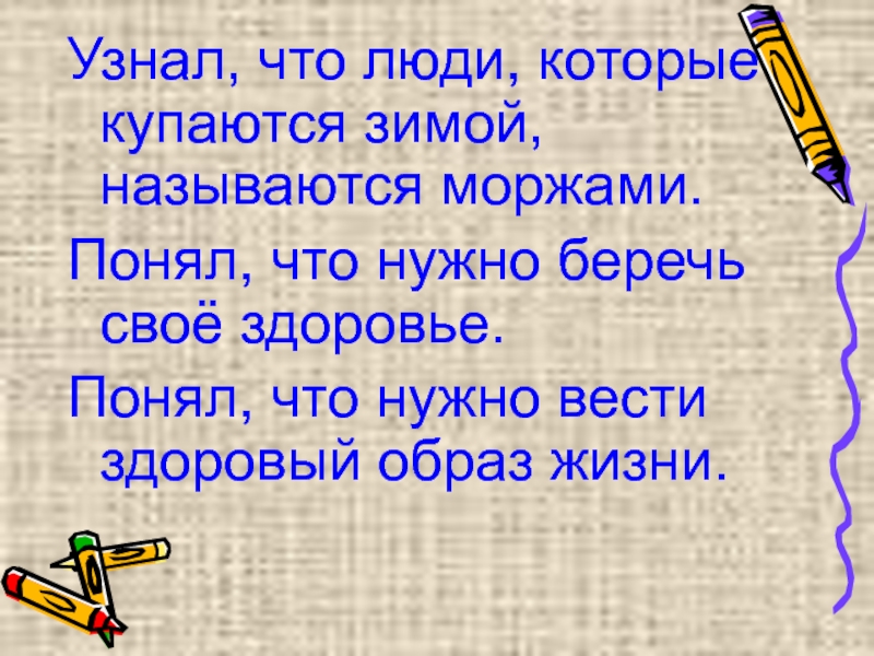 Узнал, что люди, которые купаются зимой, называются моржами. Понял, что нужно беречь своё здоровье.Понял, что нужно вести