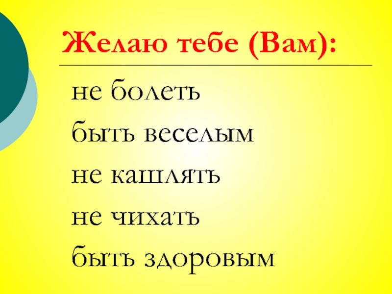 Желаю тебе (Вам): не болеть быть веселым не кашлять не чихать быть здоровым