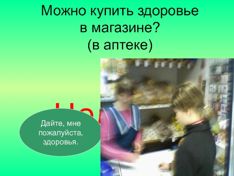 Можно купить здоровье  в магазине? (в аптеке) Нельзя!Дайте, мне пожалуйста, здоровья.