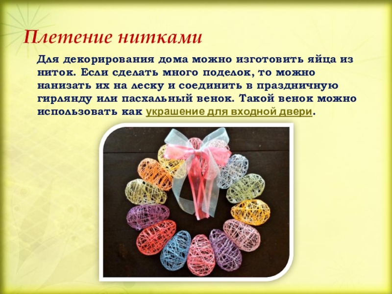 много поделок, то можно нанизать их на леску и соединить в праздничную гирлянду или пасхальный венок. Такой венок можно использовать как украшение для входной двери.