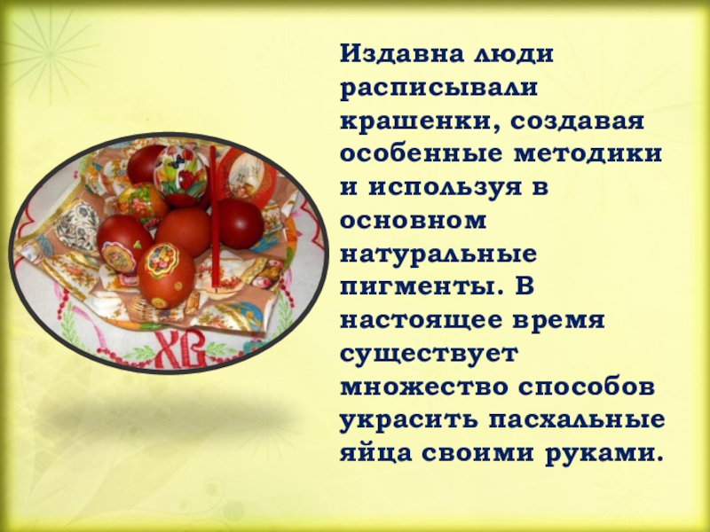 Слайд 8Издавна люди расписывали крашенки, создавая особенные методики и используя в основном