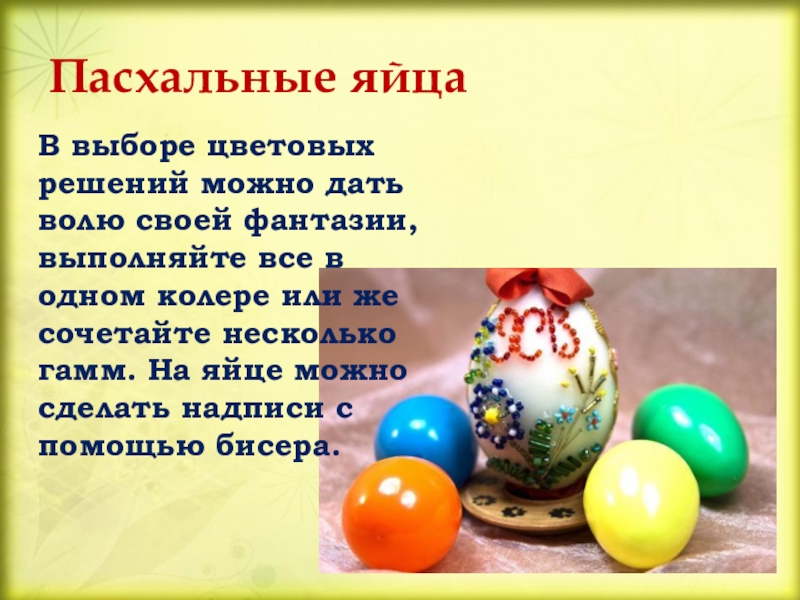 все в одном колере или же сочетайте несколько гамм. На яйце можно сделать надписи с помощью бисера.