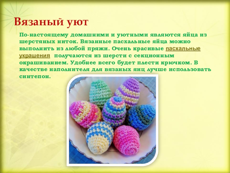 По-настоящему домашними и уютными являются яйца из шерстяных ниток. Вязанные