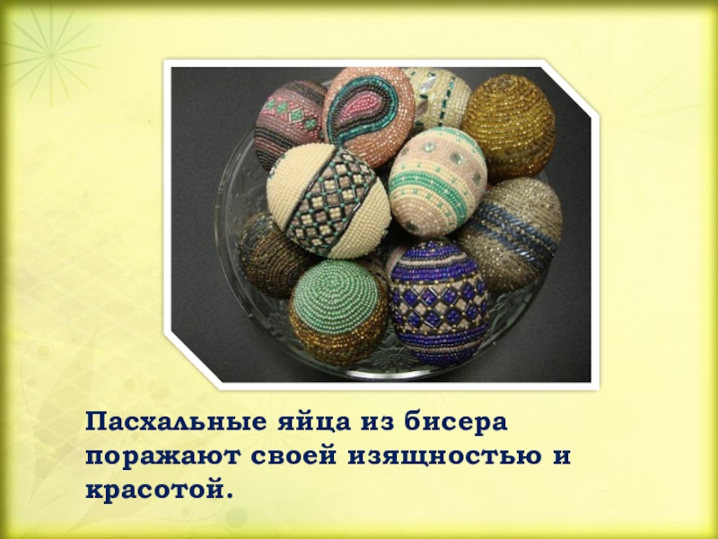 Слайд 33. «Вдохновение» – пасхальные яйца, выполненные в технике вышивки, бисероплетения.