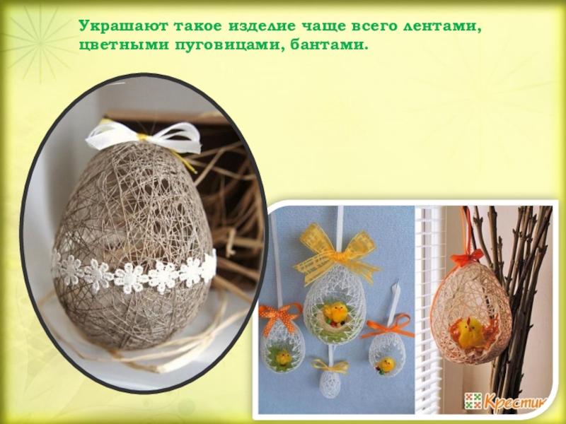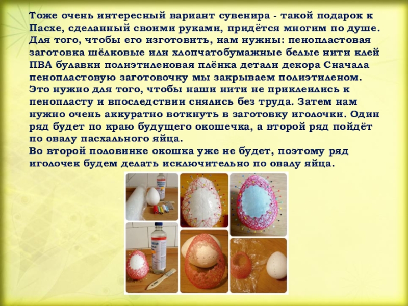 Слайд 20Тоже очень интересный вариант сувенира - такой подарок к Пасхе, сделанный