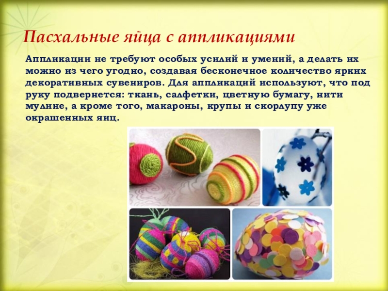 делать их можно из чего угодно, создавая бесконечное количество ярких декоративных сувениров. Для аппликаций используют, что под руку подвернется: ткань, салфетки, цветную бумагу, нити мулине, а кроме того, макароны, крупы и скорлупу уже окрашенных яиц.