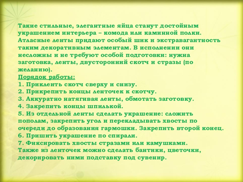 Слайд 32Такие стильные, элегантные яйца станут достойным украшением интерьера – комода или