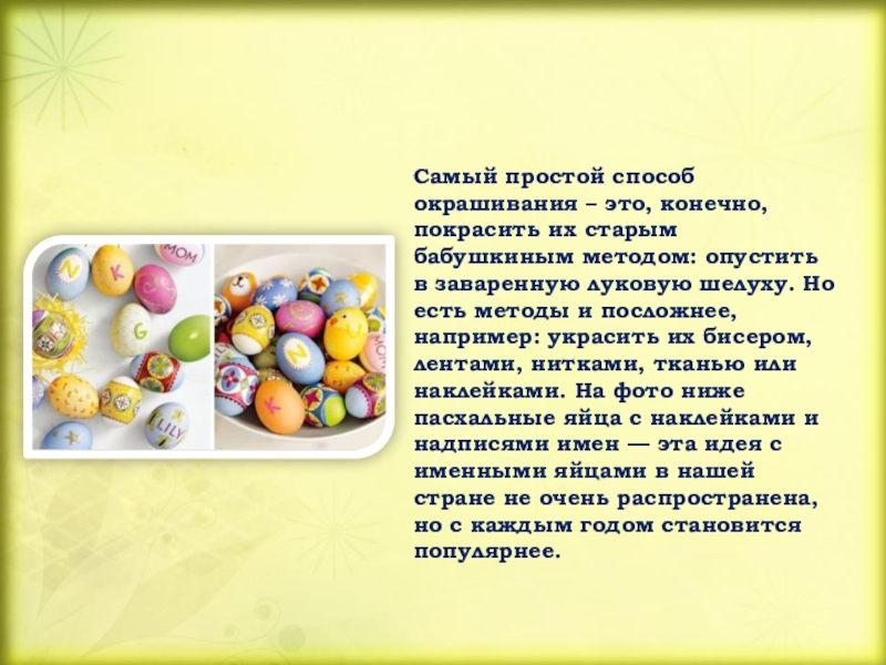 методом: опустить в заваренную луковую шелуху. Но есть методы и посложнее, например: украсить их бисером, лентами, нитками, тканью или наклейками. На фото ниже пасхальные яйца с наклейками и надписями имен — эта идея с именными яйцами в нашей стране не очень распространена, но с каждым годом становится популярнее.