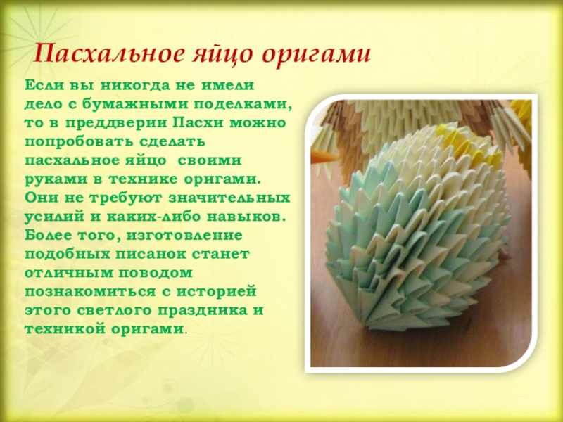 то в преддверии Пасхи можно попробовать сделать пасхальное яйцо своими руками в технике оригами. Они не требуют значительных усилий и каких-либо навыков. Более того, изготовление подобных писанок станет отличным поводом познакомиться с историей этого светлого праздника и техникой оригами.