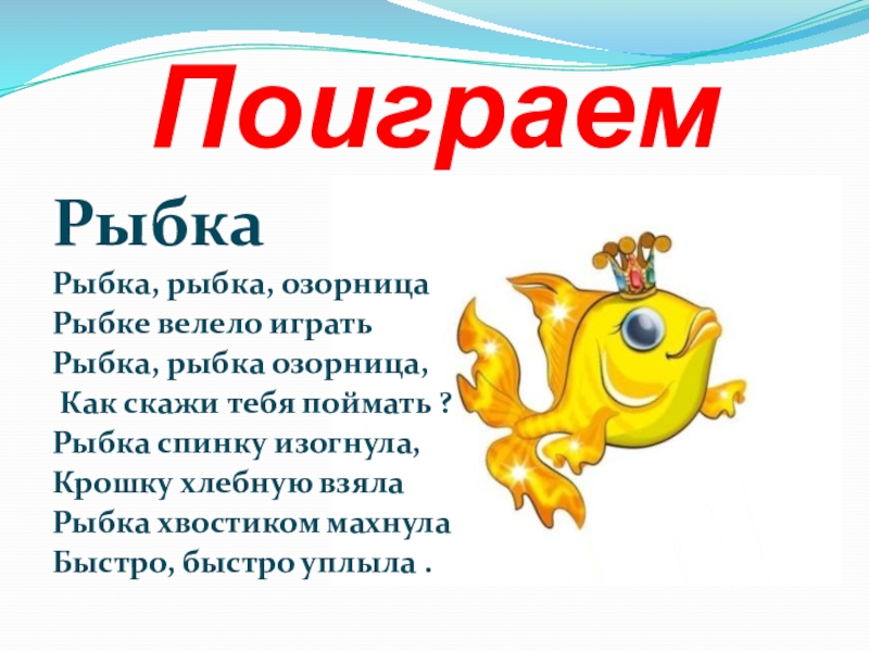 ПоиграемРыбкаРыбка, рыбка, озорницаРыбке велело игратьРыбка, рыбка озорница, Как скажи тебя поймать ?Рыбка спинку изогнула,Крошку хлебную взялаРыбка хвостиком
