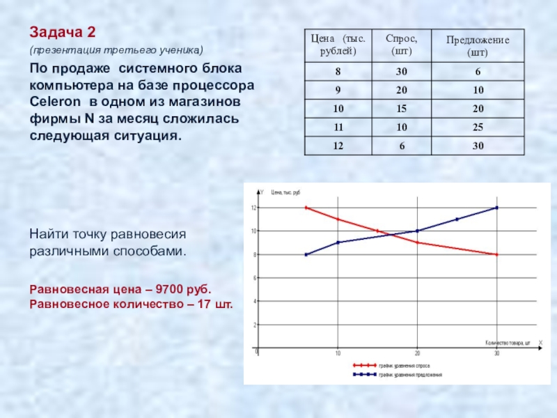 Равновесная цена – 9700 руб. Равновесное количество – 17 шт.