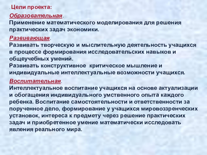 Интеллектуальное воспитание учащихся на основе актуализации и обогащения индивидуального умственного опыта каждого ребенка. Воспитание самостоятельности и ответственности за порученное дело, формирование у учащихся мировоззренческих установок, интереса к предмету через решение практических задач и приобретенное умение математически исследовать явления реального мира.
