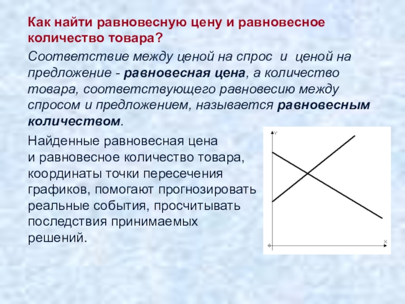 спрос и ценой на предложение - равновесная цена, а количество товара, соответствующего равновесию между спросом и предложением, называется равновесным количеством.