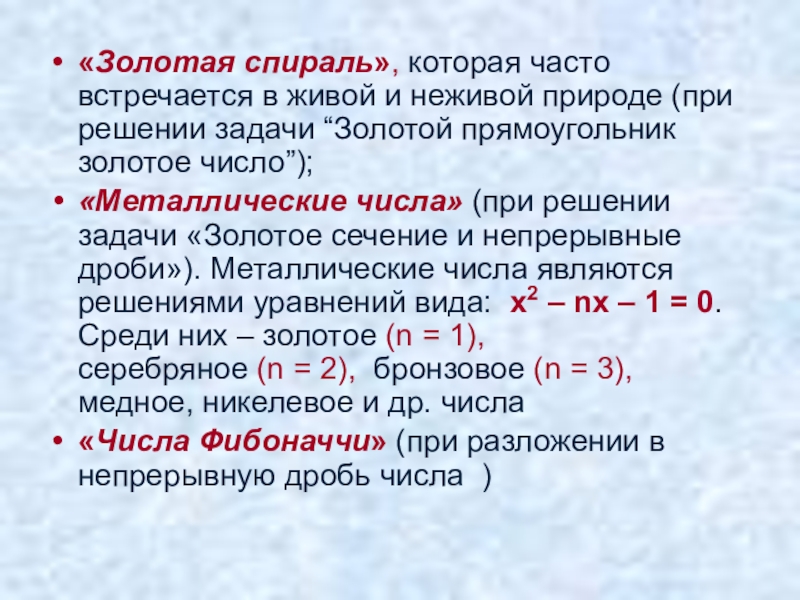 «Металлические числа» (при решении задачи «Золотое сечение и непрерывные дроби»). Металлические числа являются решениями уравнений вида: x2 – nx – 1 = 0. Среди них – золотое (n = 1), серебряное (n = 2), бронзовое (n = 3), медное, никелевое и др. числа