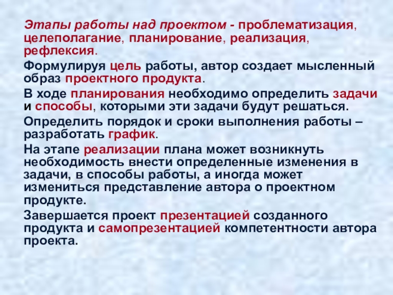 Слайд 7Этапы работы над проектом - проблематизация, целеполагание, планирование, реализация, рефлексия.