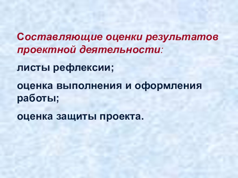 Слайд 8Составляющие оценки результатов проектной деятельности: