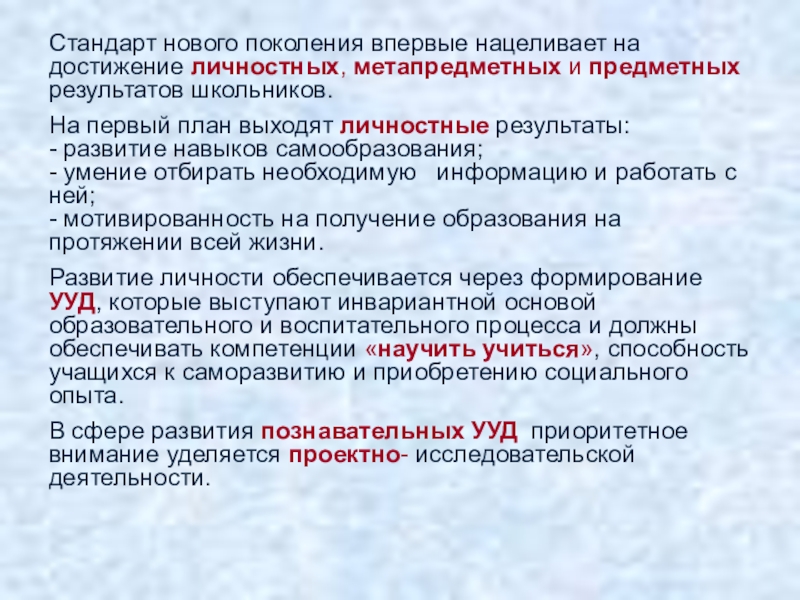 Слайд 2Стандарт нового поколения впервые нацеливает на достижение личностных, метапредметных и предметных