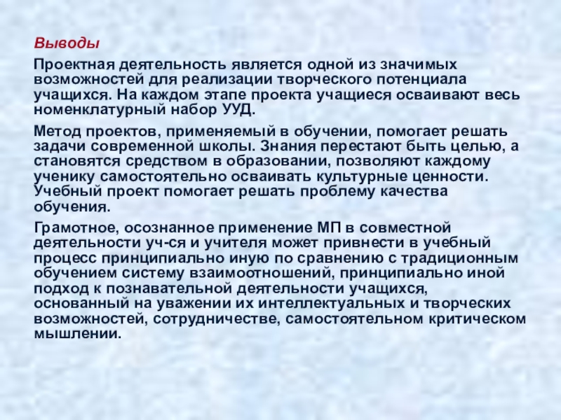 Грамотное, осознанное применение МП в совместной деятельности уч-ся и учителя может привнести в учебный процесс принципиально иную по сравнению с традиционным обучением систему взаимоотношений, принципиально иной подход к познавательной деятельности учащихся, основанный на уважении их интеллектуальных и творческих возможностей, сотрудничестве, самостоятельном критическом мышлении.