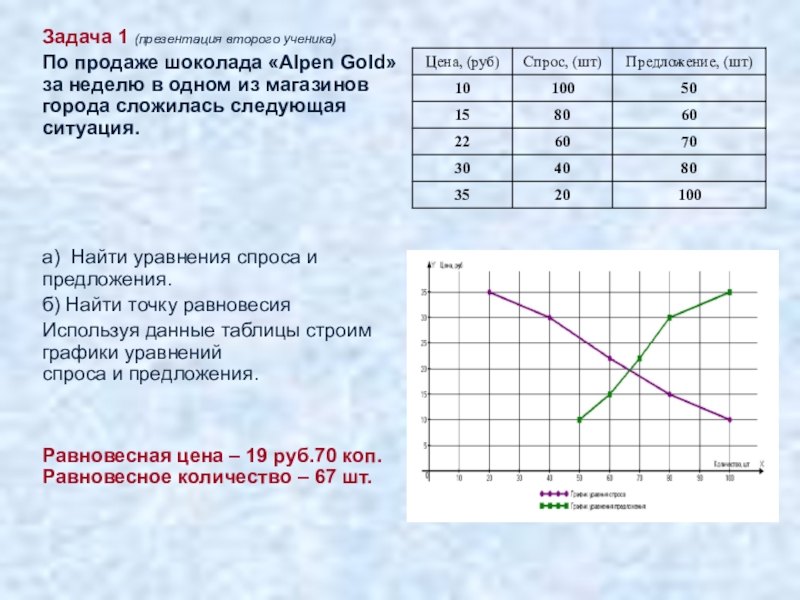 Равновесная цена – 19 руб.70 коп. Равновесное количество – 67 шт.