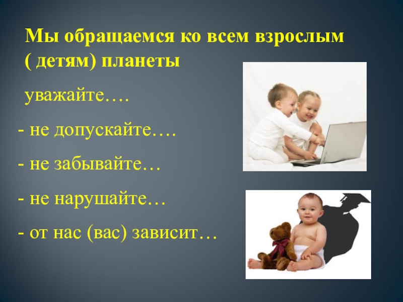 Это сайт презентаций, где можно хранить и обмениваться своими презентациями, докладами, проектами, шаблонами в формате PowerPoint с другими пользователями. Мы помогаем школьникам, студентам, учителям, преподавателям хранить и обмениваться учебными материалами.
