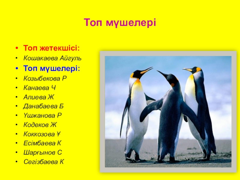Топ мүшелеріТоп жетекшісі:Кошакаева Айгуль Топ мүшелері:Козыбекова РКанаева ЧАлиева ЖДанабаева БҮшжанова РКодеков ЖКоккозова ҰЕсімбаева КШарғынов ССегізбаева К